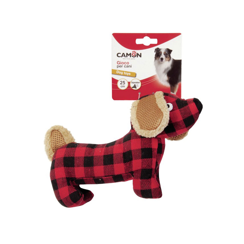 Grazioso gioco in tessuto a forma di cagnolino in piedi. Dotato di squeaker interno.