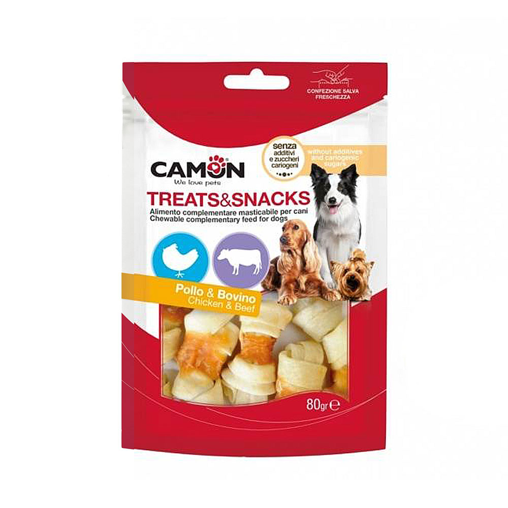 Questi alimenti complementari masticabili per cani adulti sono costituiti da un osso annodato di pelle bovina con pollo.