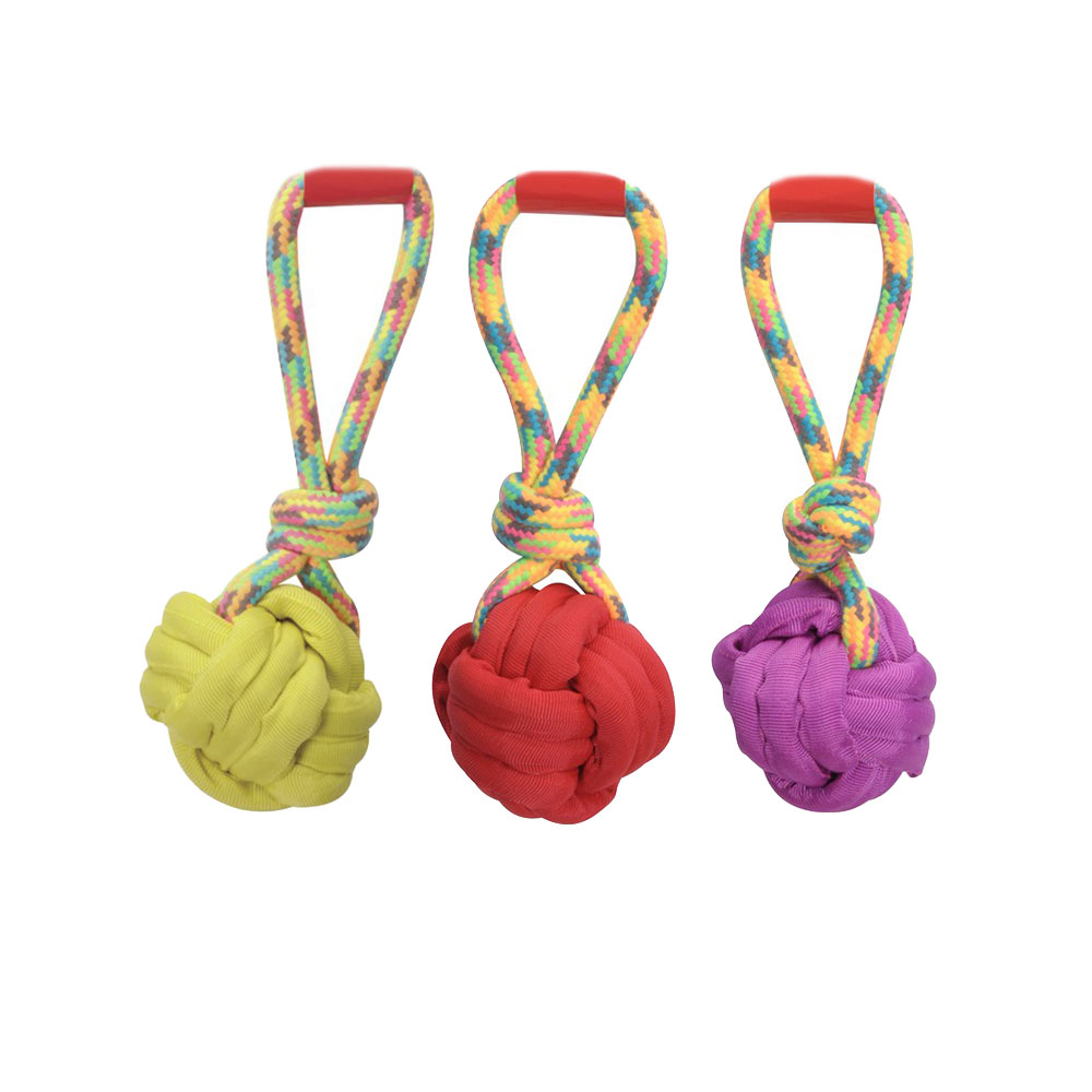 Divertente gioco per cani costituito da una palla intrecciata con maniglie in corda.