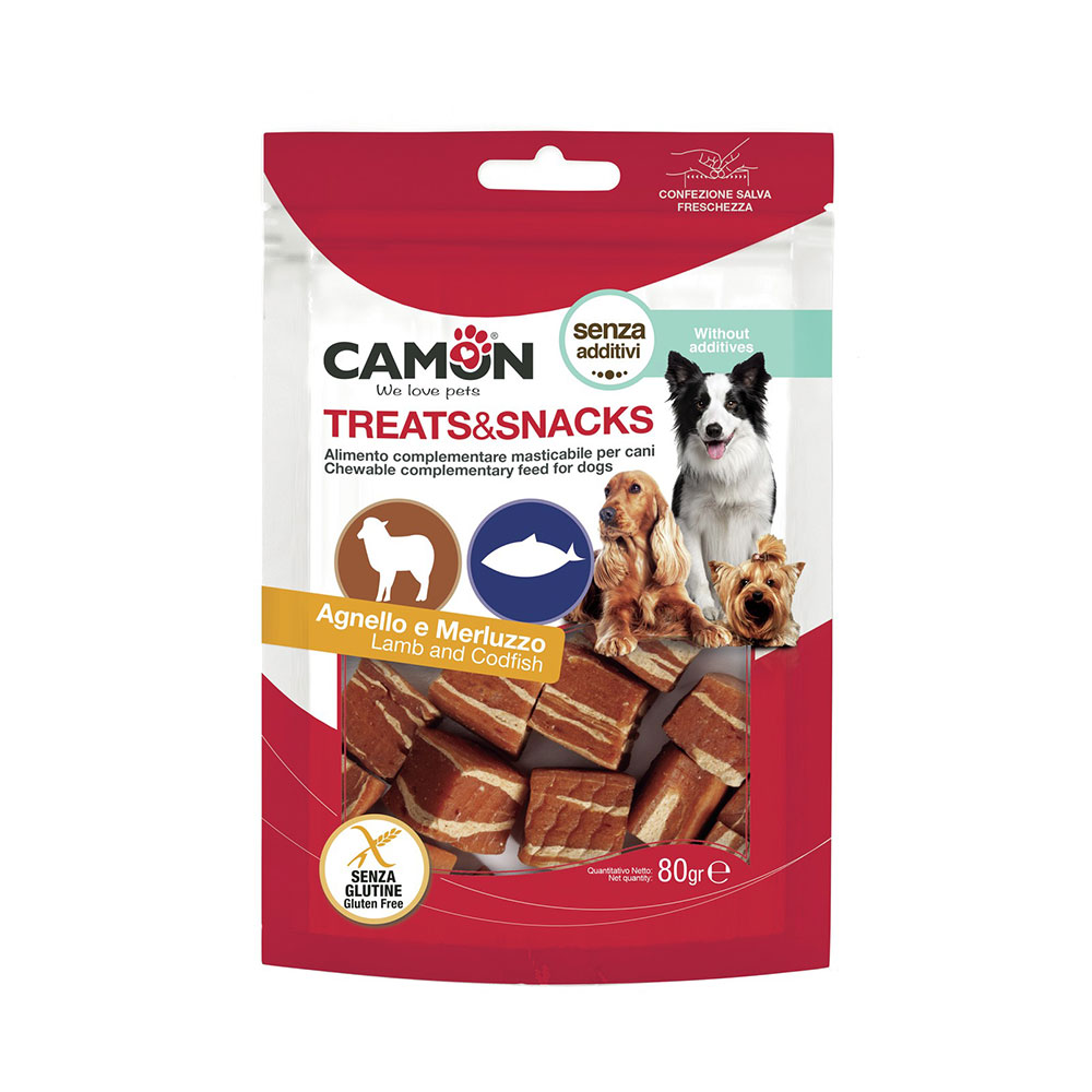Deliziosi spuntini ricompensa per cani adulti a base di agnello e merluzzo.