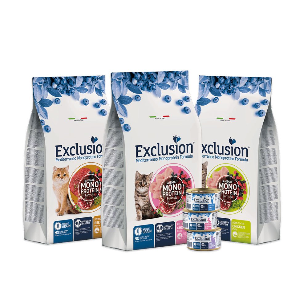 Exclusion Mediterraneo Noble Grain รฉ un alimento completo e bilanciato, formulato con una sola fonte proteica animale disidratata, per una ricetta chiara ed essenziale, e con solo un cereale nobile di alta qualitร . La specifica formulazione aiuta il buon funzionamento delle vie urinarie ed รจ preservato con antiossidanti naturali. ร realizzato con una innovativa ricetta con Superfood della tradizione Mediterranea: melagrana, more, lamponi e mirtilli neri. ร arricchito con Psyllium per aiutare a contrastare la formazione dei boli di pelo. Senza grasso di pollo, frumento, soia e mais aggiunti.
