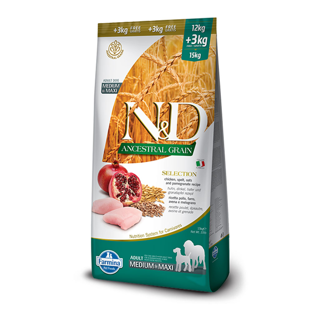 Caratteristiche Farmina N&D Ancestral Grain Pollo, Avena, Farro e Melograno 12Kg+3Kg Gratis
