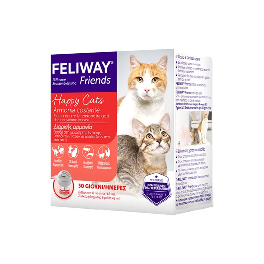 Feliway Friends è la soluzione facile da utilizzare per ridurre i conflitti tra gatti che vivono assieme, impedendo comportamenti come litigare, inseguirsi, bloccarsi, fissarsi a vicenda.