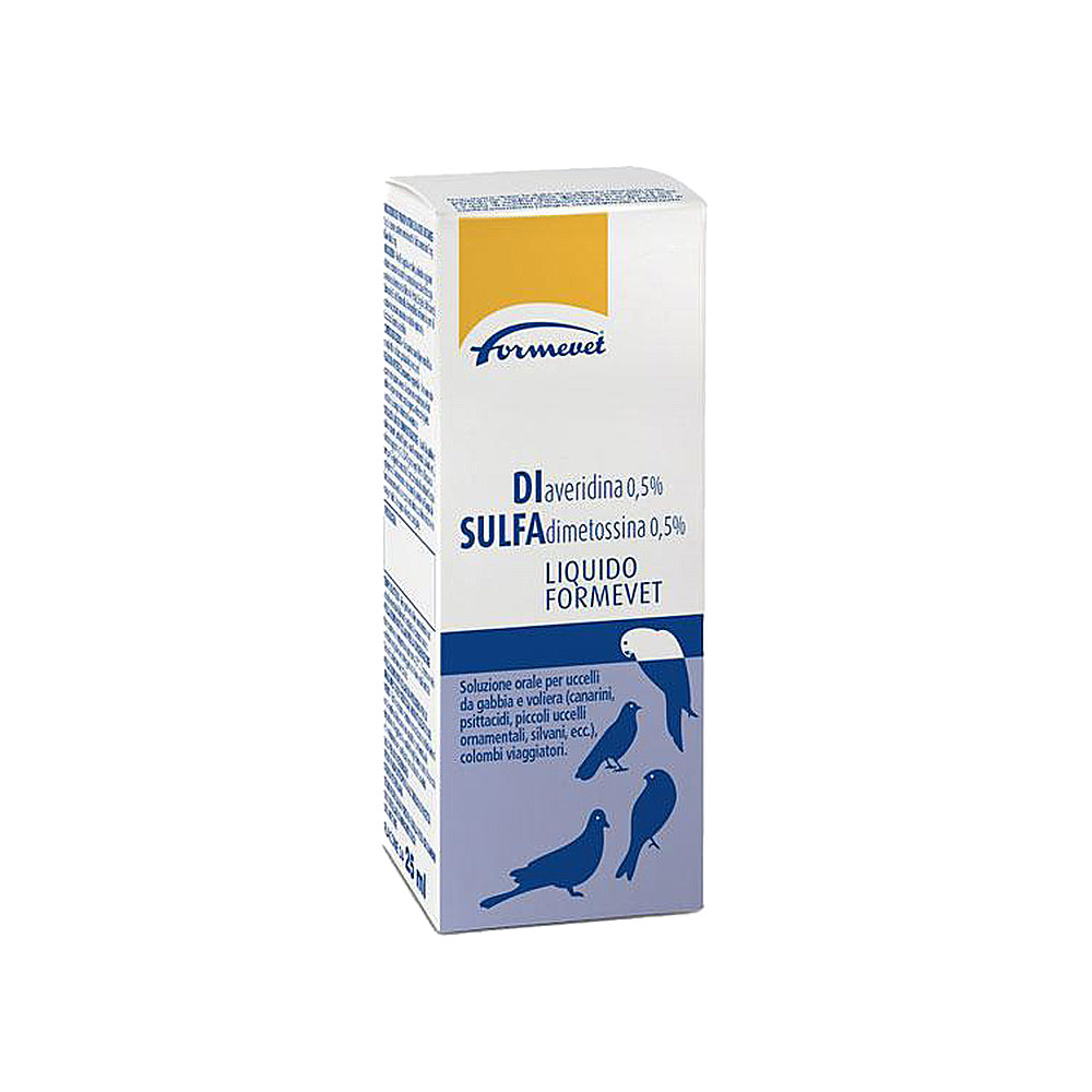 Torna allo shop– Soluzione orale per uccelli da gabbia e voliera (canarini, psittacidi, piccoli uccelli ornamentali, silvani, ecc.), colombi viaggiatori a base di Sulfadimetossina e Diaveridina.