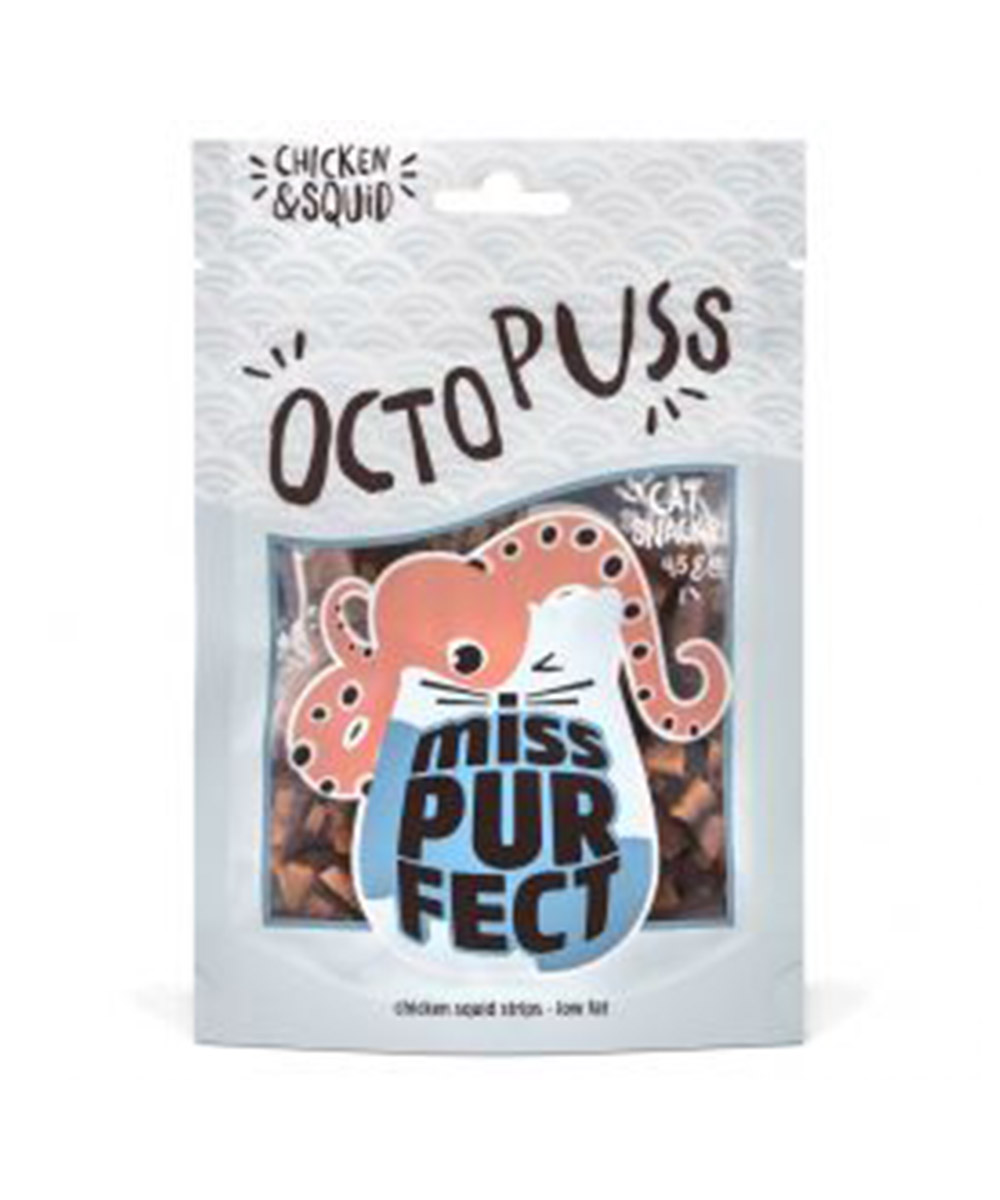 Miss Purfect Octopuss con pollo e calamari è uno spuntino delizioso per il tuo amico. Miss Purfect, un’ampia gamma di prelibatezze salutari per gatti ricche di proteine ​​di carne o pesce e garantiamo un’elevata appetibilità . Sviluppato con veterinari e università garantiamo la migliore qualità . Fantasia con una bella storia.
