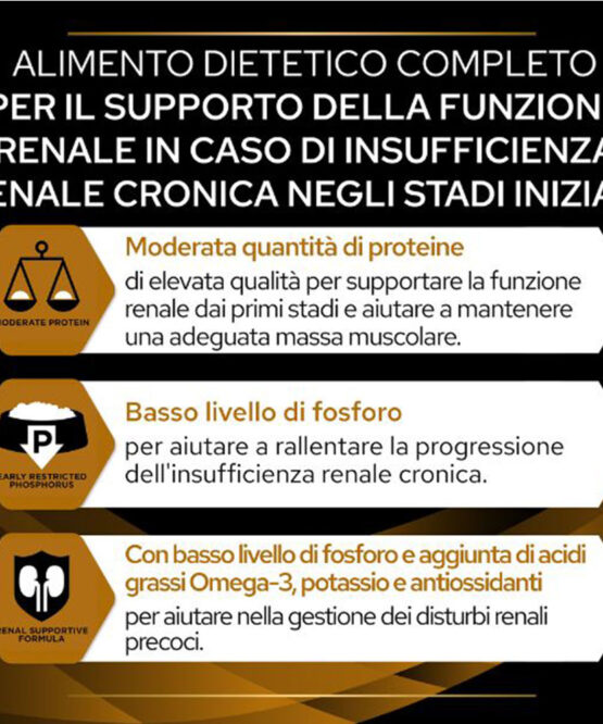Alimento dietetico secco completo per gatti adulti per il supporto della funzione renale in caso di insufficienza renale cronica, formulato con bassa concentrazione di fosforo e tenore ridotto di proteine.